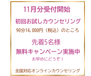 まずは、気軽な気持ちでカウンセリングの雰囲気を体験していただきたいという願いを込めて、毎月先着5名様限定で、お試しカウンセリング60分通常10,000円のところ、特別価格1,000円で体験していただいています。